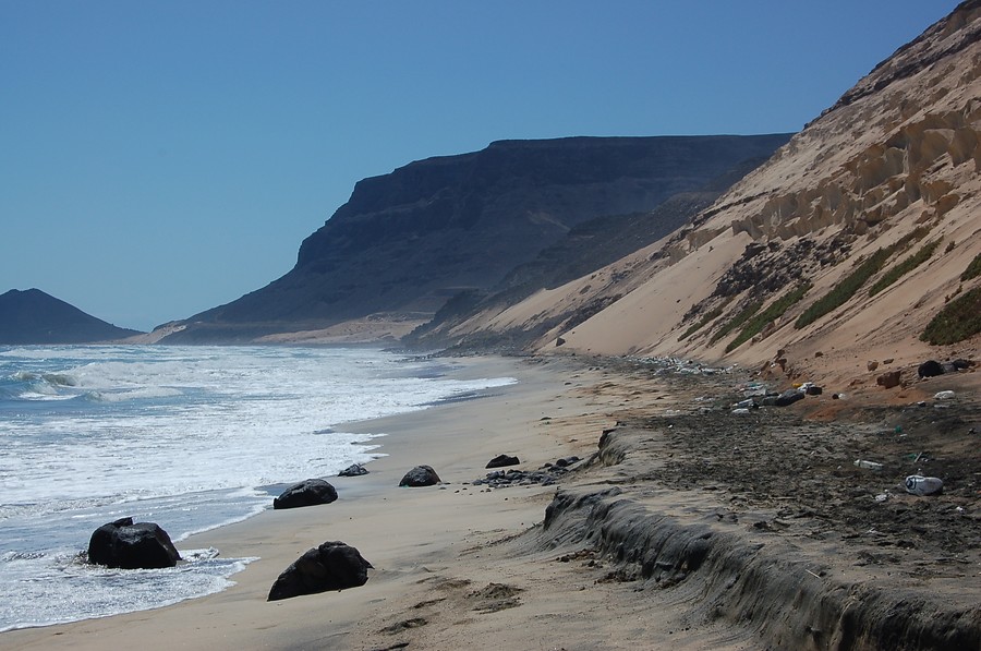 Ter kennismaking maken we vandaag een rondwandeling vanaf de rand van de stad Mindelo naar het afgelegen strand van Salamansa. Het landschap gaat gebukt onder de hier vaak strak waaiende Noordoostpassaat. Het landschap is kaal en haast woestijnachtig. En dat maakt van de stranden aan de noordkust van São Vicente geliefde surfplekken. Het kleine strandje van João d’Évora is een heerlijke pauzeplek. Hoog boven de kust en tenslotte door witte duinen en over een mooi strand wandelen we naar het vissersdorpje Salamansa, dat de laatste jaren door surfers ontdekt is. Het strandtentje verzorgt heerlijke crèpes en een duik in de oceaan is hier een aanlokkelijk en verfrissend intermezzo. De terugtocht voert over een pas waarbij we uitzicht hebben op de hoogste berg van het eiland, de Monte Verde, en in de afdaling over de stad Mindelo. Lengte 10km, 350m stijgen en dalen, duur 4 uur.